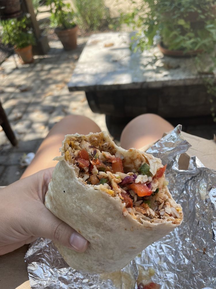 Grilled marinated chicken, feta cheese, Greek seasoning, onions, tomatoes and cucumbers, shredded lettuce and a cucumber yogurt sauce.