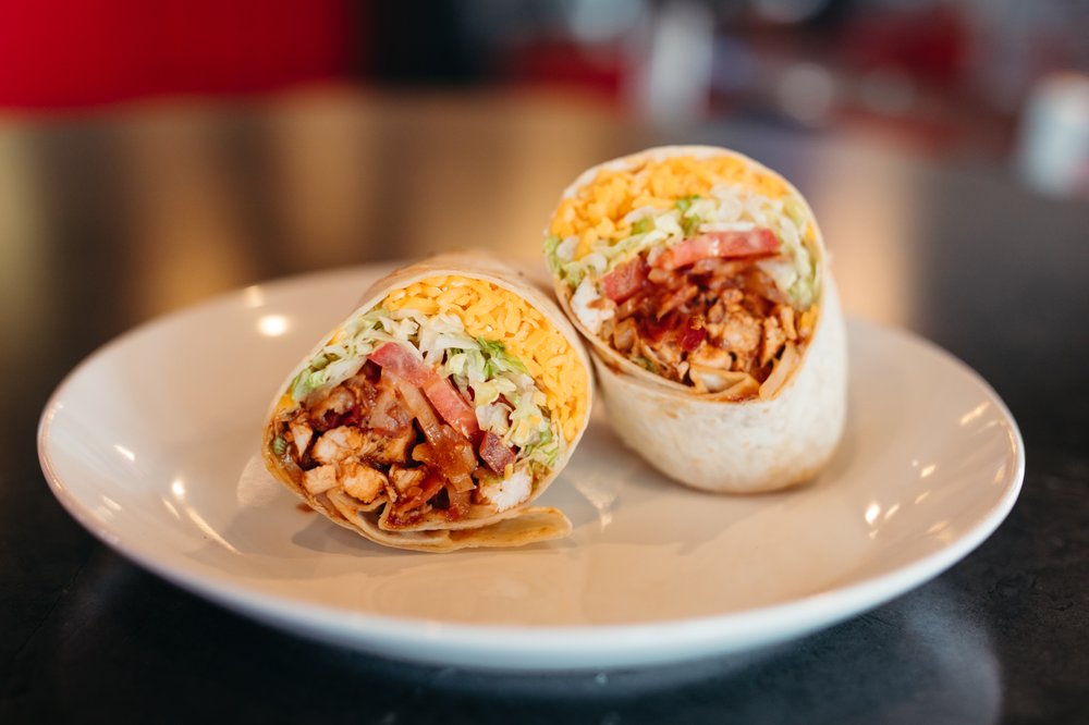 Marinated grilled chicken in a tortilla on top of ourjalapeno cream cheese spread with sliced tomatoes, bacon, cheese blend, shredded lettuce, and avocado lime ranch to finish!